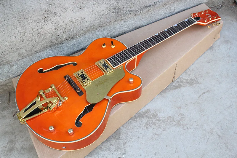 .Gallery of Factory custom orange hollow body electric guitar with gold hardware,tremolo system,golden tuners,can be customized